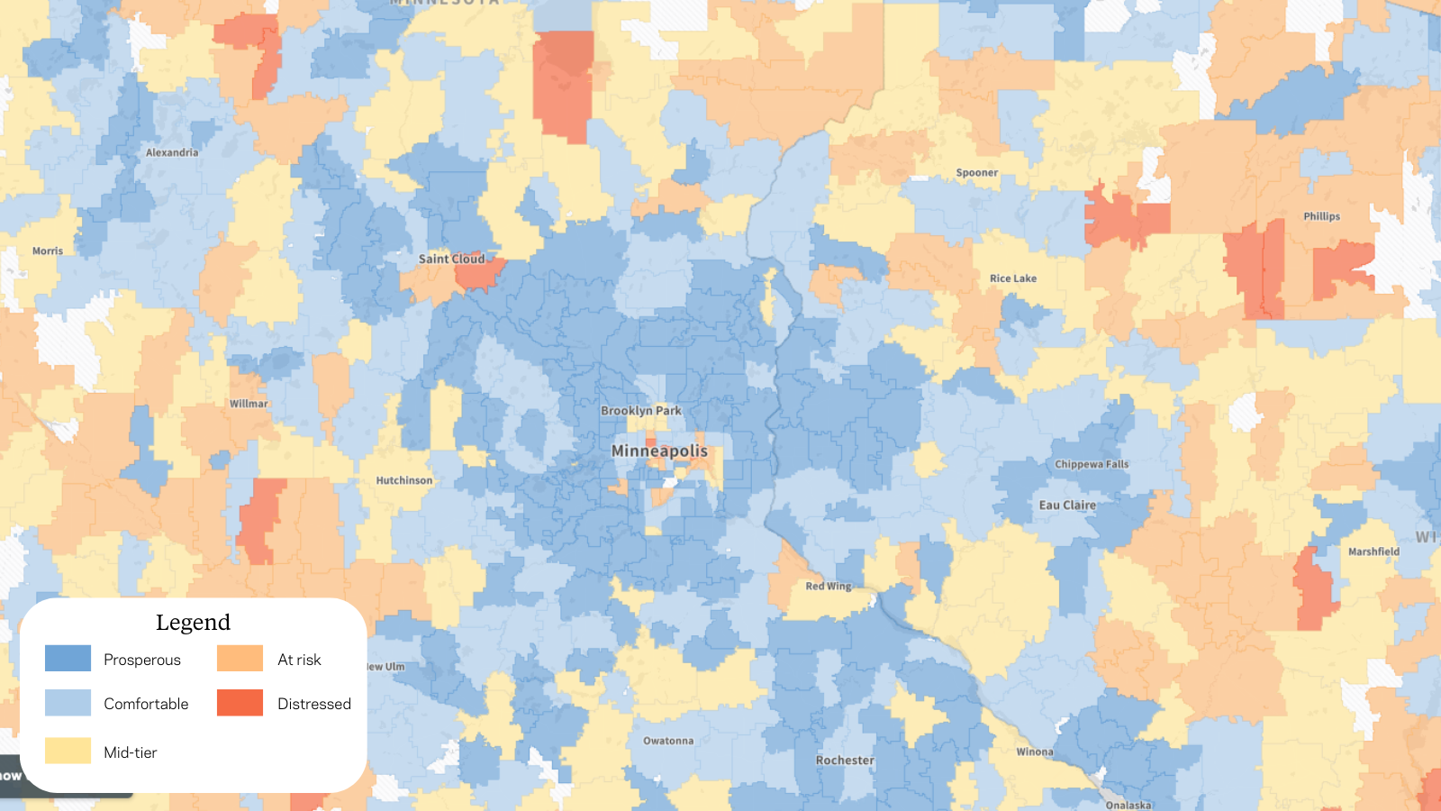 The Minneapolis metropolitan area has the largest cluster of prosperous zip codes with an above-average economic connectedness value. The suburban zip codes that ring the urban core have an average economic connectedness value of 1.2, indicating a high degree of connection between low- and high-SES individuals. In this cluster’s typical zip code, the median household income stands at $101,700, and 42 percent of the population holds a bachelor’s degree or higher.