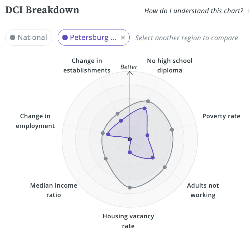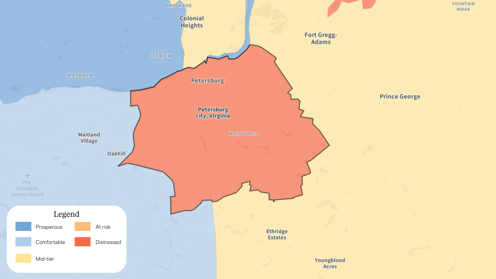 There are ongoing efforts to revitalize Petersburg’s historic downtown and create economic opportunities for its residents. However, these statistics, paired with the DCI, reflect a community grappling with concentrated hardship that impacts adults and children alike.