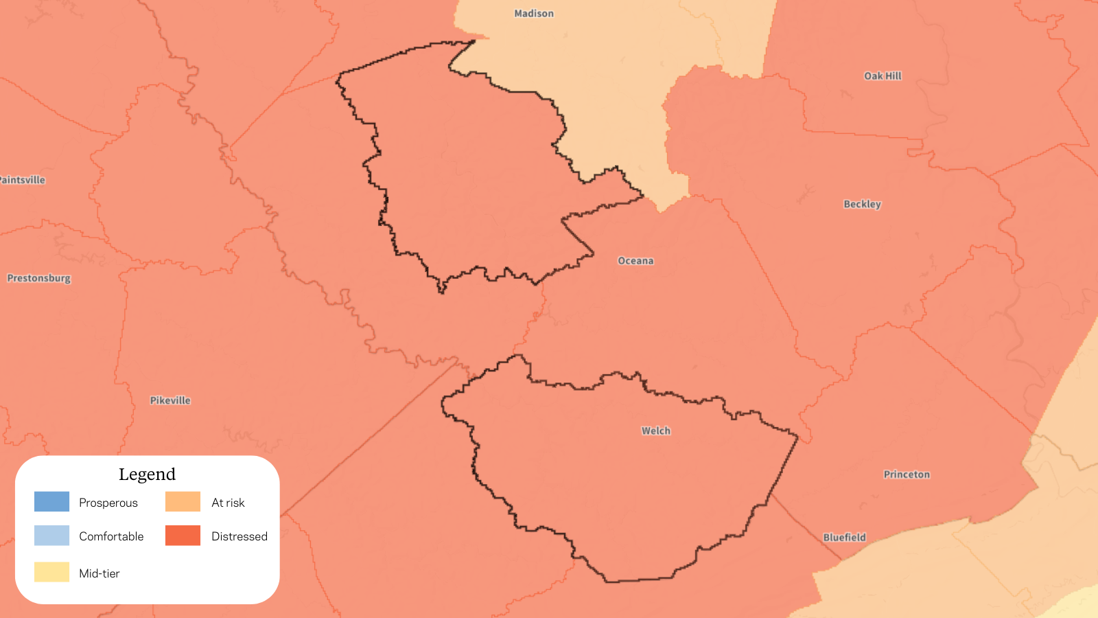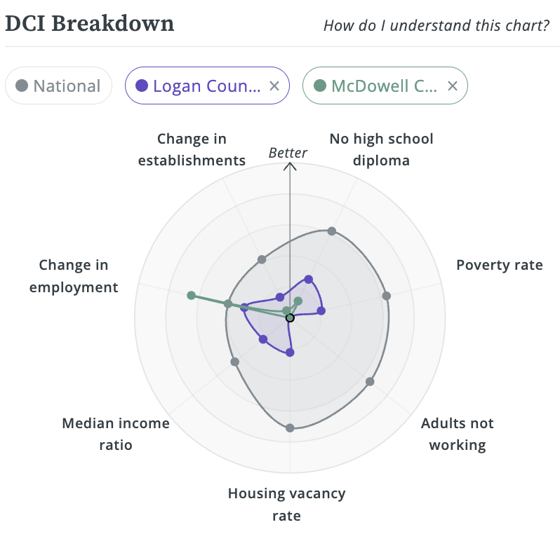 These sobering statistics are inextricably linked to the region’s severe economic hardship. McDowell and Logan are two of the most distressed counties in the country. A staggering 70 percent of prime-age adults in McDowell County are out of work, and Logan County fares little better, with just under half of its prime-age population employed.