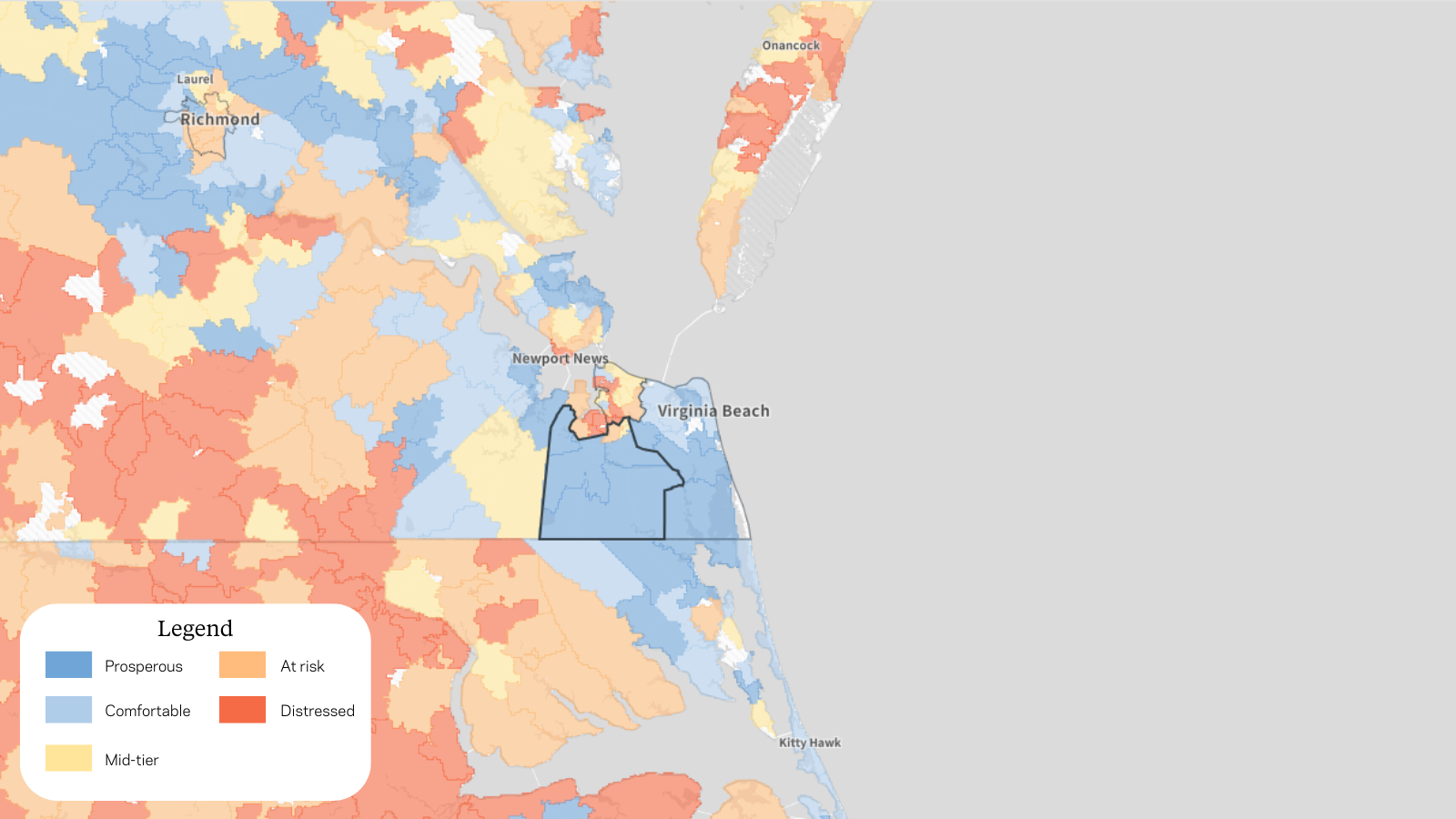 Situated in the Hampton Roads metropolitan area, the city and the surrounding region are defined by a strong military presence and a thriving tourism industry centered around Atlantic coast resorts. Chesapeake exhibits low poverty rates, high educational achievement, and relatively high incomes.