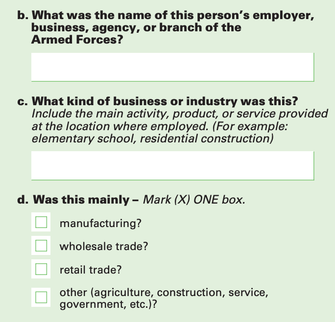 “What kind of business or industry was this? Include the main activity, product, or service provided at the location where employed. (For example: elementary school, residential construction).[3]