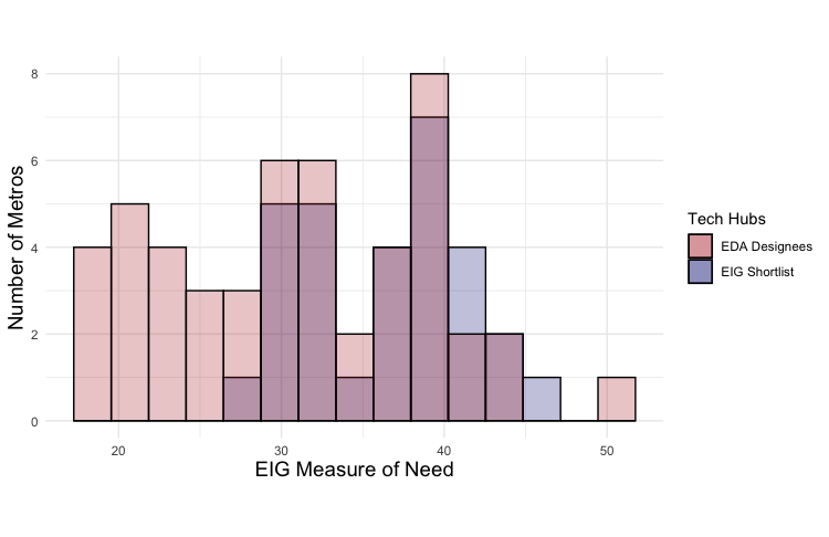 Another consideration: the impact of awards to already-large innovation ecosystems may be hard to empirically detect, reducing the value of this policy experiment to future federal place-based development efforts.